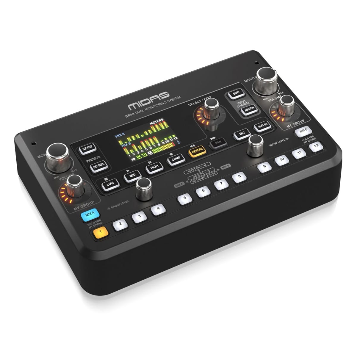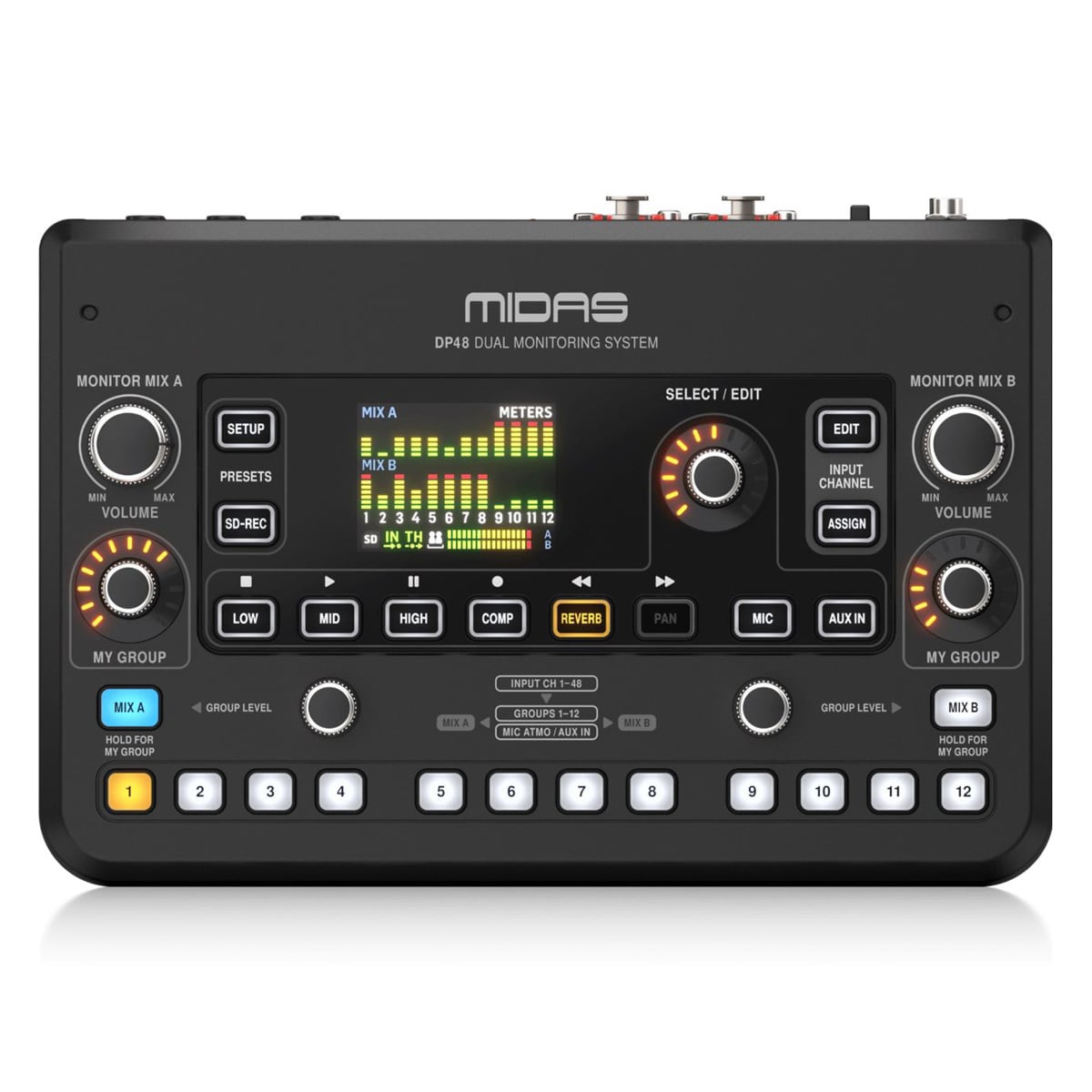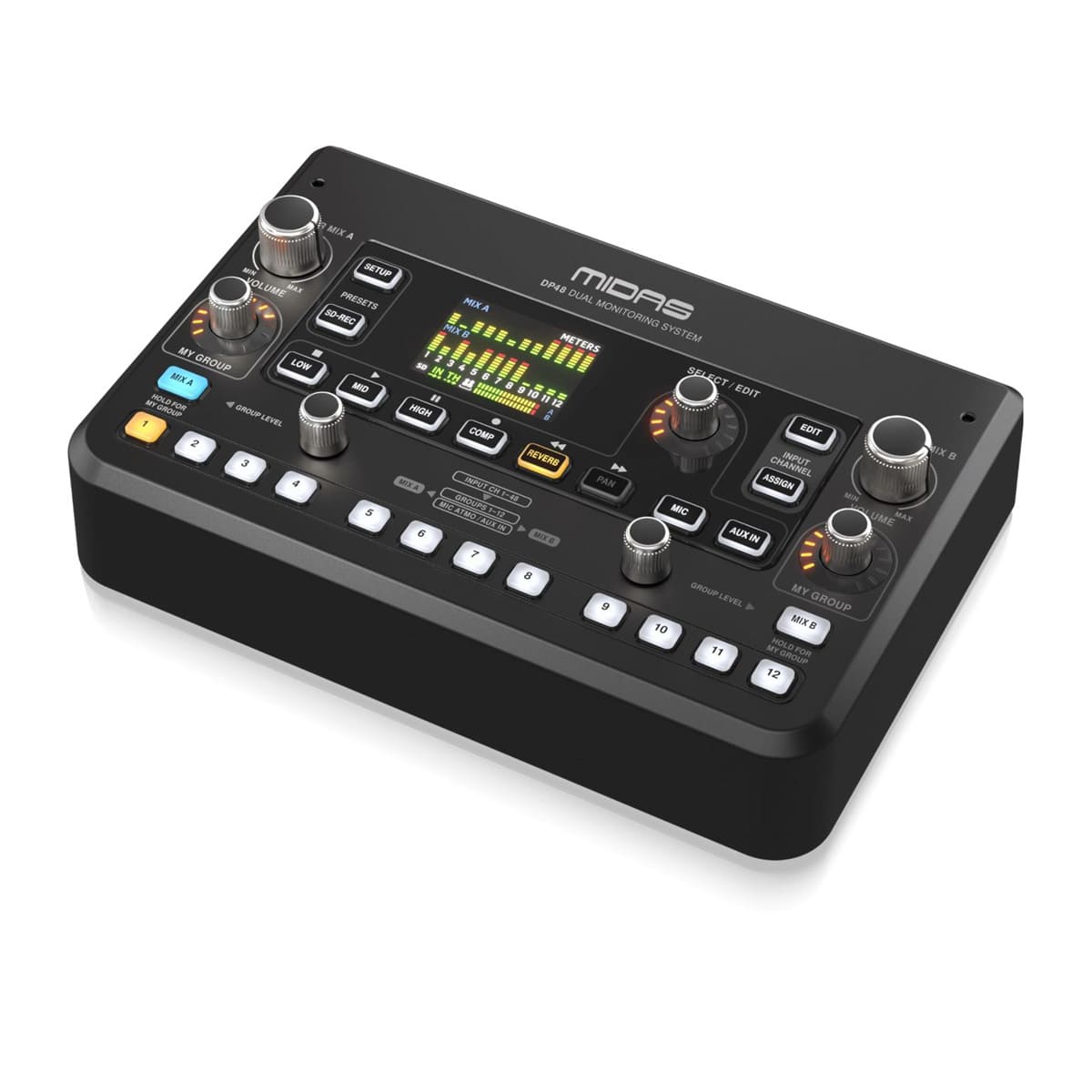 - Dual 48 channel personal monitor mixer compatible with Midas personal monitoring system hubs